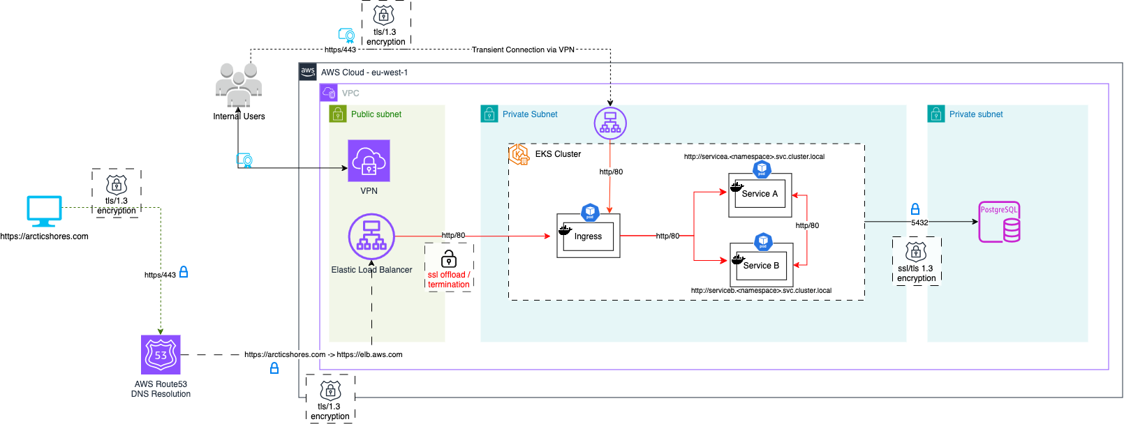 From the off you can see the most important parts were well encrypted, all public traffic to either load balancer is encrypted requiring TLS 1.3.