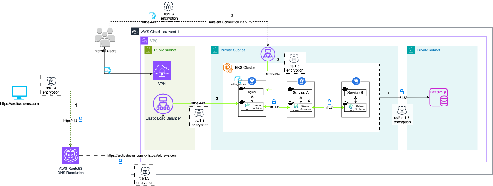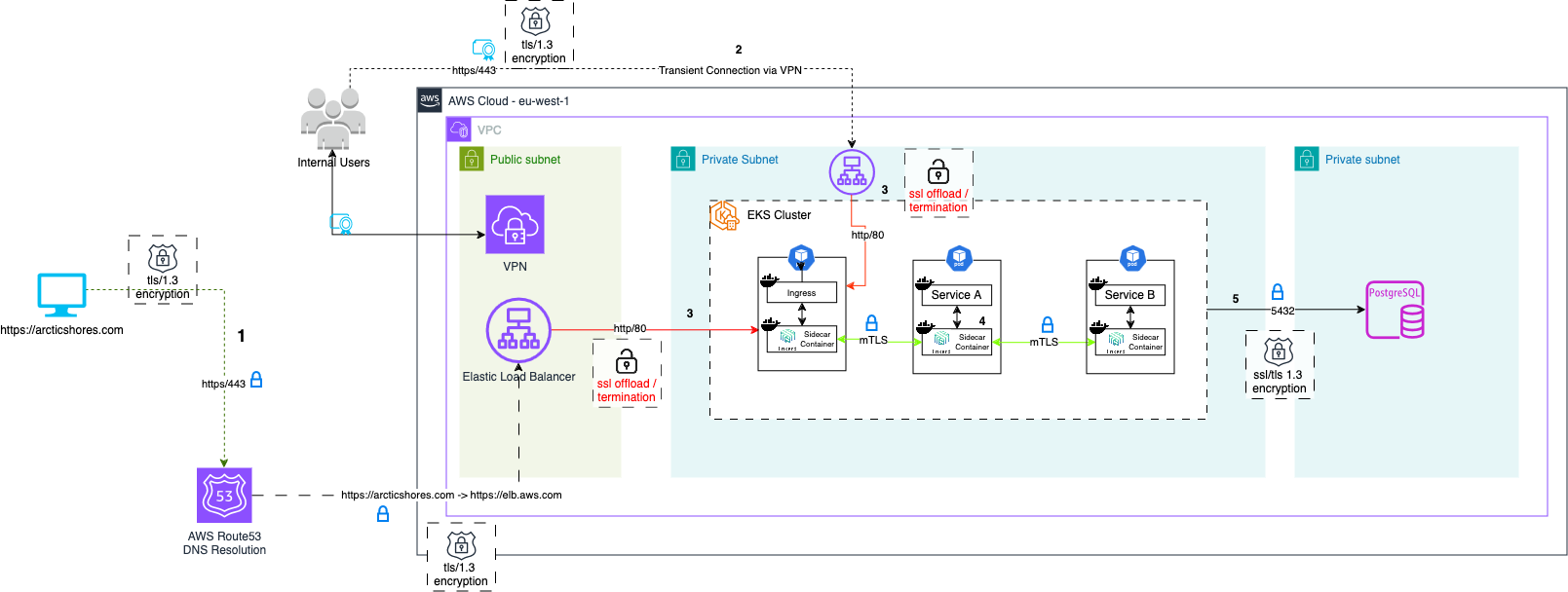 Starting from connection 1 on the diagram, you’ll see that our external users access the ALB sitting in the public subnet where data is encrypted in transit using HTTPS/TLS 1.3.
